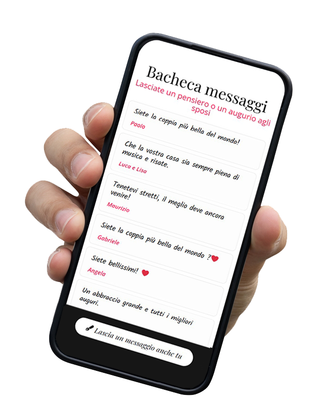 Con la Bacheca Messaggi di Lovepage, i tuoi invitati possono lasciare un pensiero, un augurio o un ricordo del vostro giorno speciale direttamente dal sito del matrimonio.